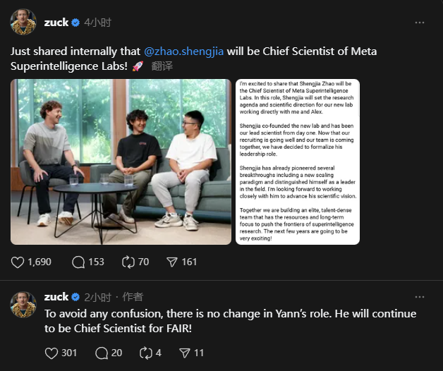 近日,Meta首席执行官马克·扎克伯格宣布,前OpenAI研究员赵晟佳将担任Meta超级智能实验室(MSL)的首席科学家。详情>>